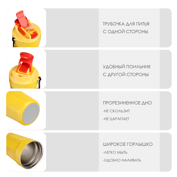 Классическая модель термо кружки выполнена из нержавеющей стали, которая не взаимодействует с содержимым и не меняет его состава, запаха или вкуса. Элементы термокружки обладают высокой прочностью и легко моются: достаточно промыть изделие с помощью неагрессивного моющего средства. Термокружка оснащена ремешком, благодаря чему её удобно носить с собой. Благодаря компактным размерам и эргономичному дизайну, она легко помещается в сумку или рюкзак, что делает ее идеальным выбором для путешествий, прогулок и активного образа жизни.