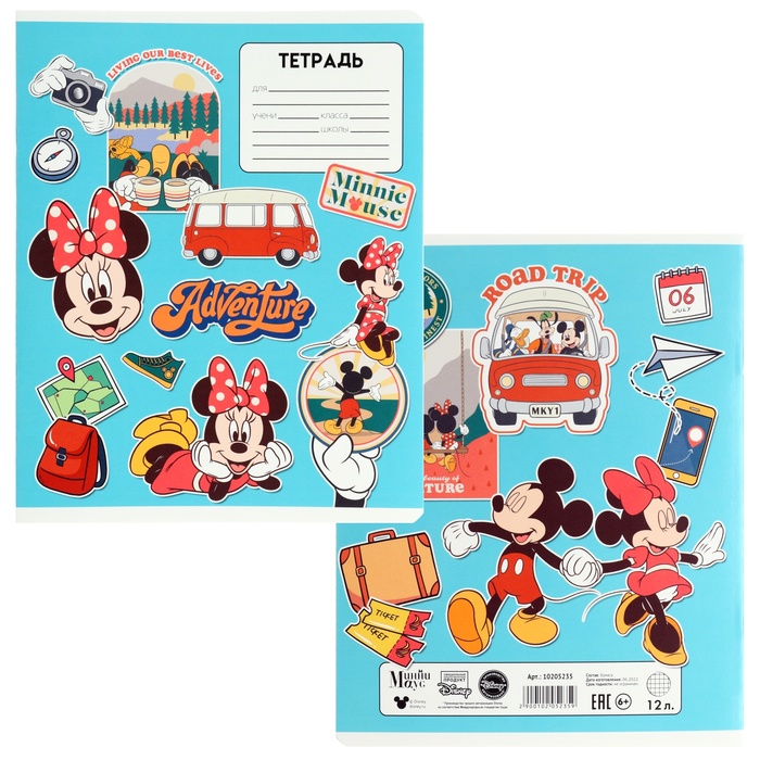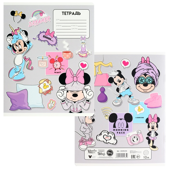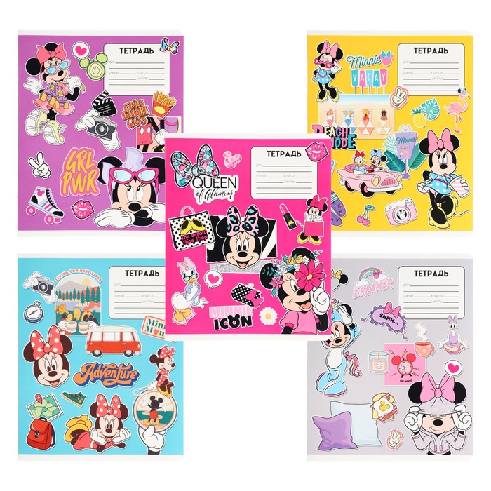 Тетрадь в клетку 12 листов, 5 видов МИКС, обложка мелованный картон, «Минни Маус»