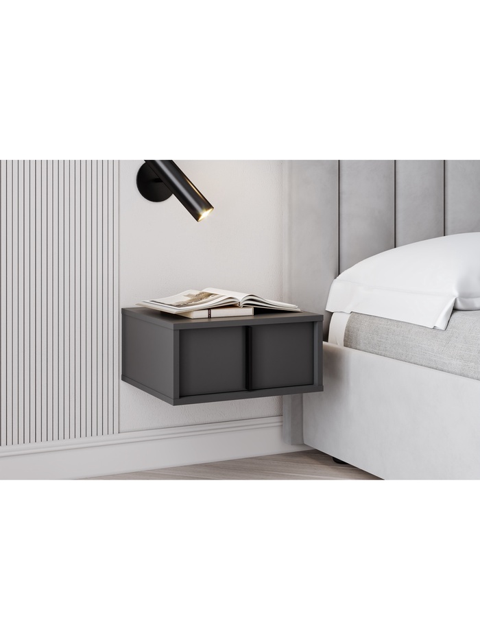 Элемент коллекции «Тео – универсальные малые формы». Компактная модель в оттенке антрацит предназначена для настенного размещения и подходит для использования как самостоятельный модуль или в составе мебельного комплекта.