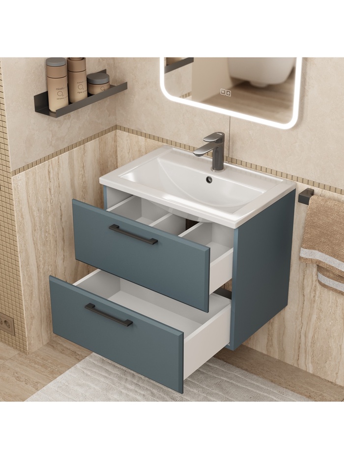 - Элегантный дизайн: тумба украшена приятной на ощупь матовой поверхностью Soft Touch, гармонично дополняющей интерьер ванной комнаты.