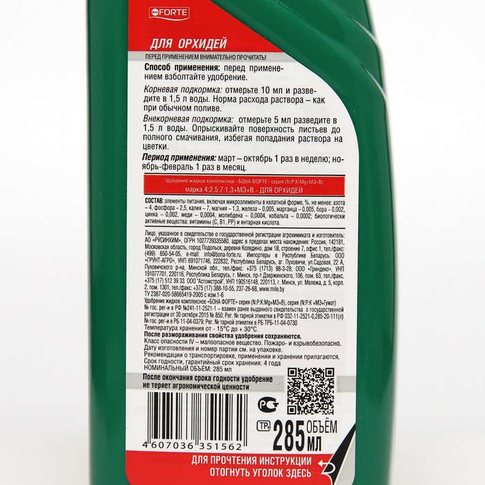 NPK+Mg (6:4:5 + 1 ), микроэлементы, витамины, стимулятор роста - янтарная кислота.Cрок годности: 4 года.После окончания срока годности удобрение не теряет своей агрономической ценности.Температура хранения: -15° до +30° С.После размораживания продукт сохраняет свои свойства.