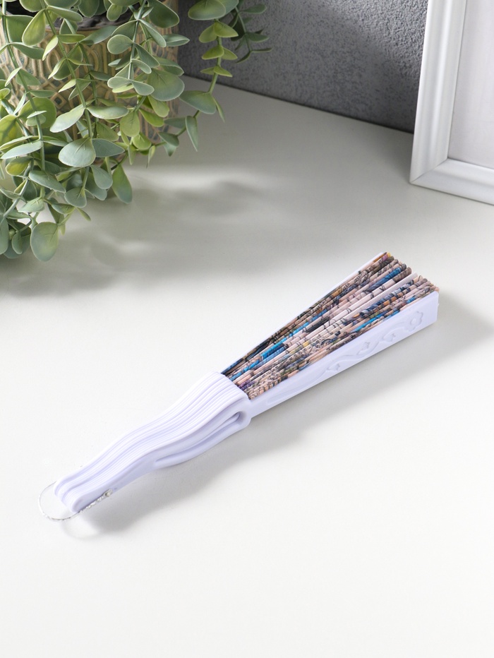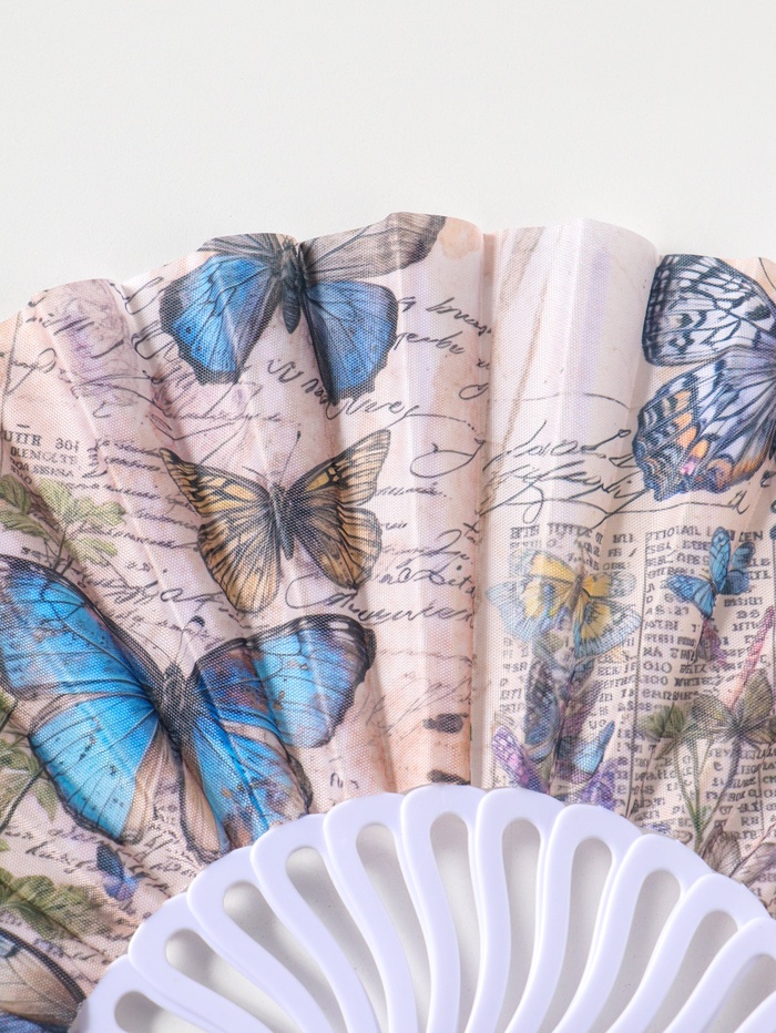 Веер пластик, текстиль "Синие бабочки и старые газеты" 22,5 см