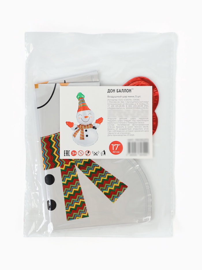 Воздушные шары фольгированные 17" «Веселый снеговик», 5 шт., для палочек