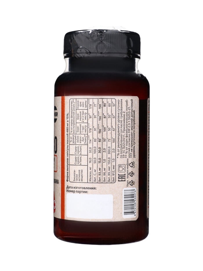 Упаковка содержит 60 капсул — оптимальный формат для месячного курса и комплексной поддержки организма железом и витаминами.
